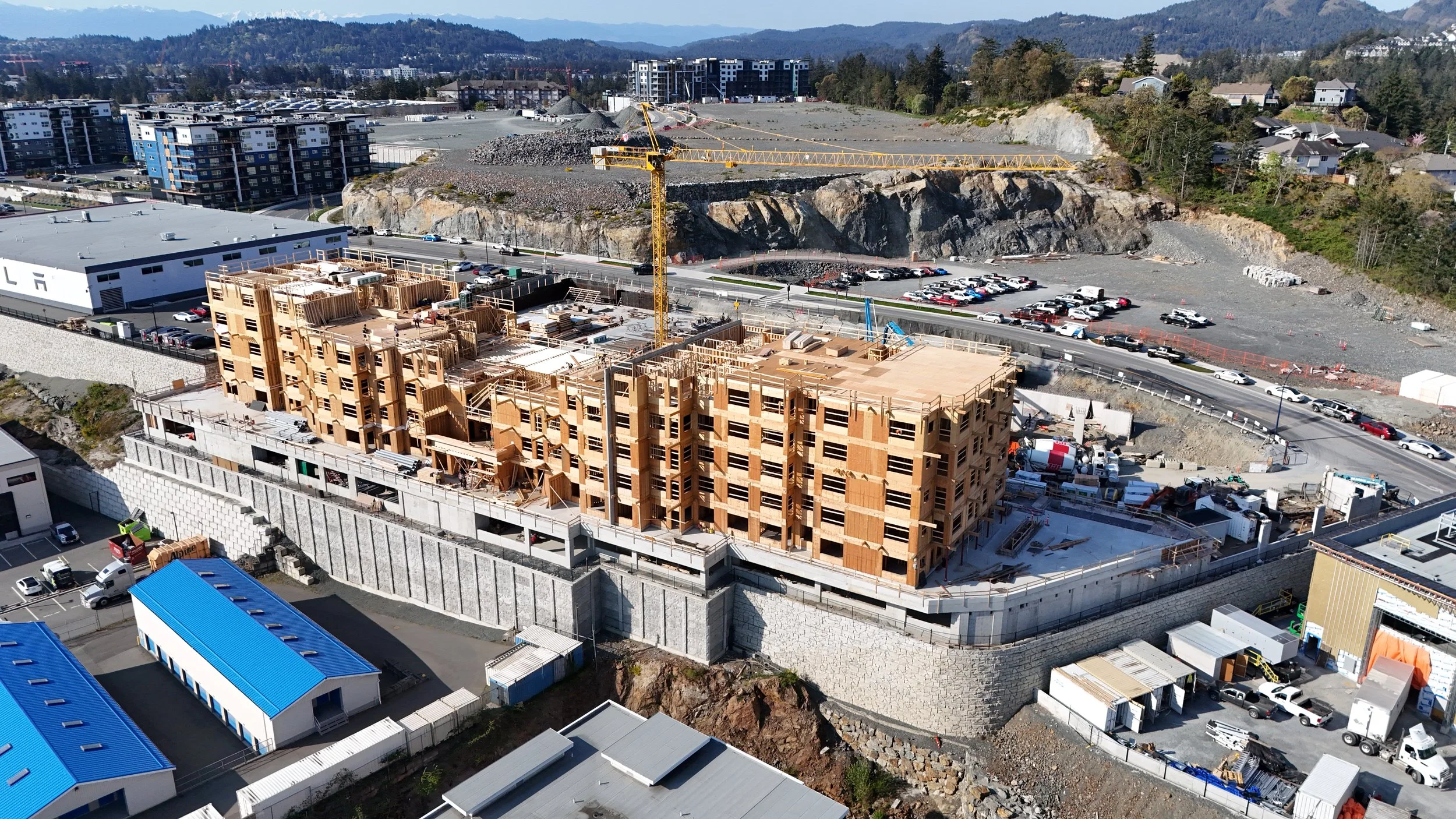 City Gate Residences is a 270-unit purpose-built rental development located in Victoria’s Westshore. The project comprises two six-storey wood-frame buildings constructed above a 2.6-acre parkade. Amenities include a gym, social lounge, rooftop patios, outdoor kitchens, a playground, and spaces for private events. Units feature high-end finishes and offer elevated views of the surrounding urban landscape.